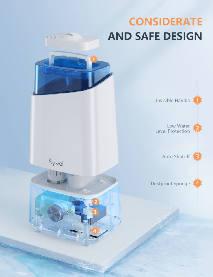 Воздухоувлажнитель KYVOL Vigoair HD3 Ultrasonic Wi-Fi Cool Blue/White (EA200) оптимален для установки в комнатах площадью до 40 м. Устройство оснащено объемным резервуаром, который обеспечивает продолжительную работу без необходимости доливания воды. Специальная система защиты предотвращает образование накипи на внутренних элементах. Модель повышает уровень влажности в помещении, что позволяет избавиться от заложенности носа, кашля и сухой кожи. Устройство KYVOL Vigoair HD3 Ultrasonic Wi-Fi Cool Blue/White (EA200) оптимально как для настольной, так и для напольной установки. Модель обеспечивает равномерное распределение пара по всему помещению, так как сопло вращается на 360°. Для изготовления корпуса производителем использован ударопрочный пластик, не подверженный различным механическим нагрузкам. Благодаря прорезиненным ножкам увлажнитель не скользит по любой гладкой поверхности.
