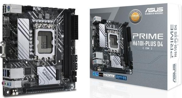 PRIME H610I-PLUS D4-CSM — материнська плата з чіпсетом Intel H610. Оснащена процесорним роз'ємом LGA 1700, виконана у форм-факторі Mini ITX, а тому оптимізована для компактних систем.