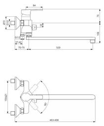 Комплектность: смеситель, излив, шланг, душ, декоративные заглушки 2 шт, эксцентрики 2шт, резинки 2 шт, подставка душа + крепления, коробка, инструкция.