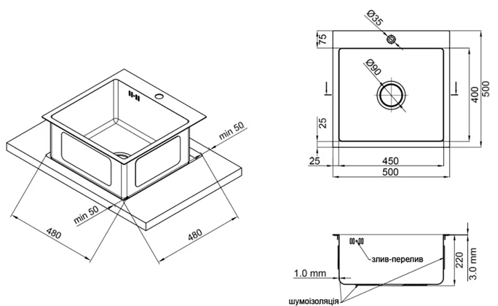 • Размеры врезного отверстия (накладная) 480x480 мм