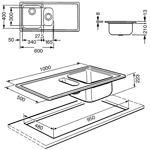- Размеры врезного отверстия (накладная) 950x480 мм
