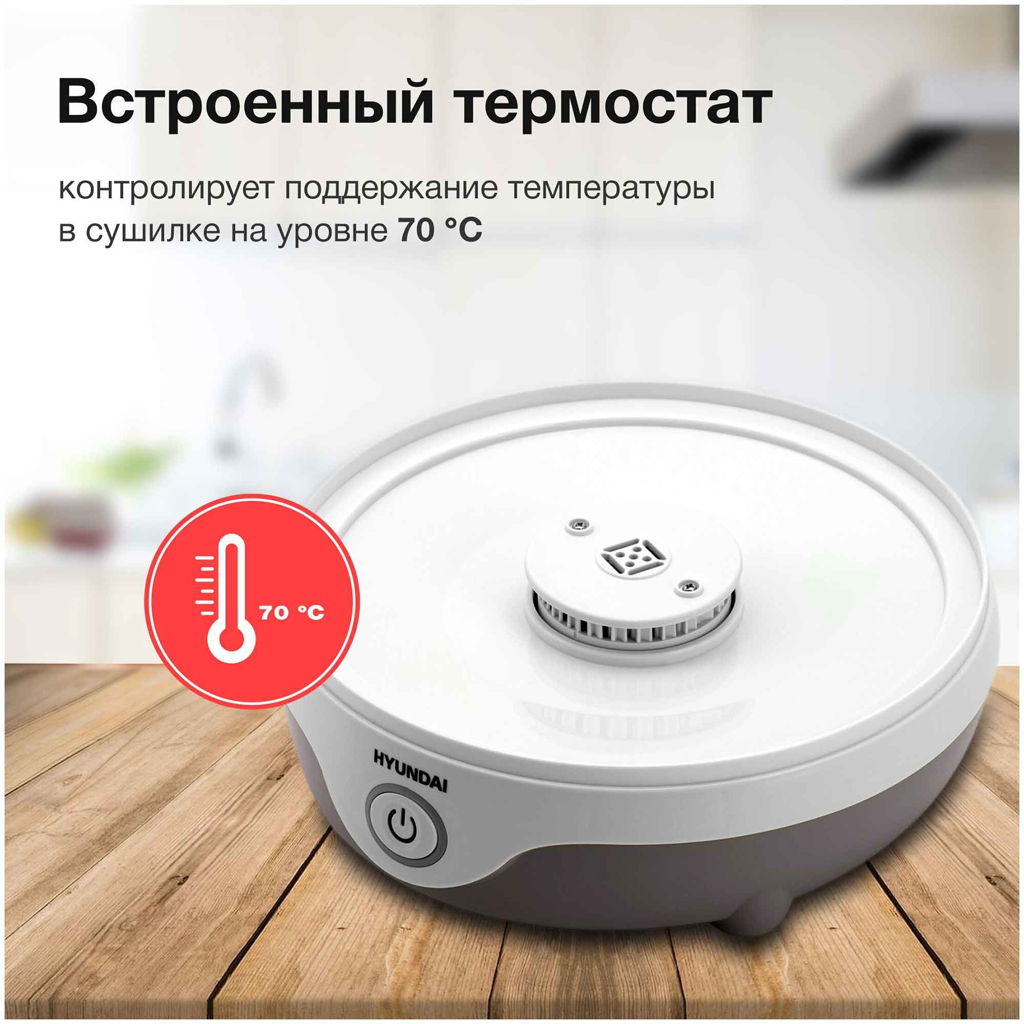 Сохранность полезных свойств фруктов, овощей, целебных трав, грибов обеспечит сушилка для овощей и фруктов HYUNDAI HYFD-0606 мощностью 250 Вт. Модель оснащена встроенным термостатом. Температура сушки может регулироваться в границах от 35 до 70 °С, в зависимости от сочности и особенностей сырья. Сушильная камера имеет пять уровней. Укомплектована пятью поддонами размером 25, 5х3х25, 5 см. Конструкция поддонов предусматривает возможность изменения расстояния между ними в пределах 1, 5 – 3 см. Это дает возможность разместить для сушки или хранения более крупные продукты. Управление – механическое, простое и удобное, с использованием всего одной кнопки. Сушилка может использоваться для приготовления пастилы.