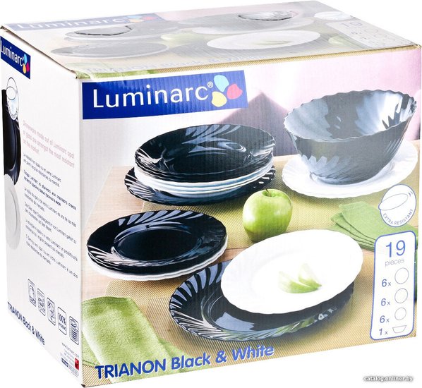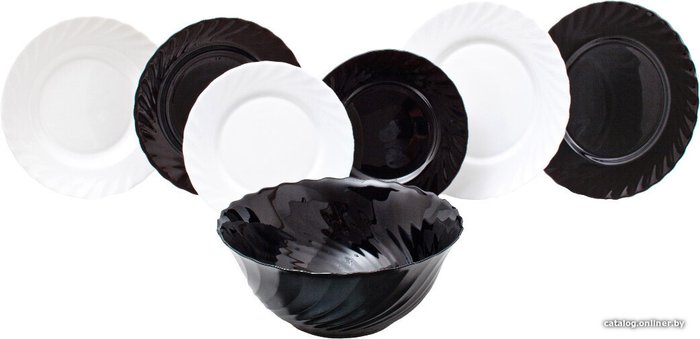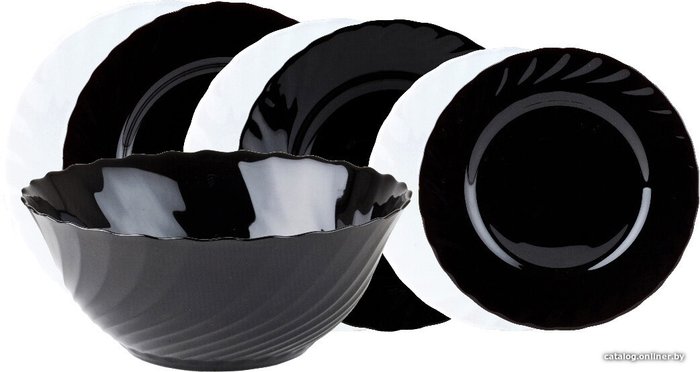 - Состав набора салатник (1 шт. черный), тарелка закусочная (десертная) (3+3 шт.), тарелка столовая глубокая (3+3 шт.), тарелка столовая обеденная (3+3 шт.)