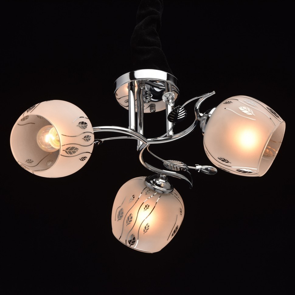 Люстра из коллекции «Грация» привнесет в обстановку легкость и свежесть. Основание из металла цвета хрома выгодно подчеркивают прозрачные плафоны из матированного стекла. Их округлая форма и нежный растительный рисунок оживляют композицию. Под стать плафонам – флористический декор. Хромированные лепестки и стеклянные капли выглядят очень живописно.