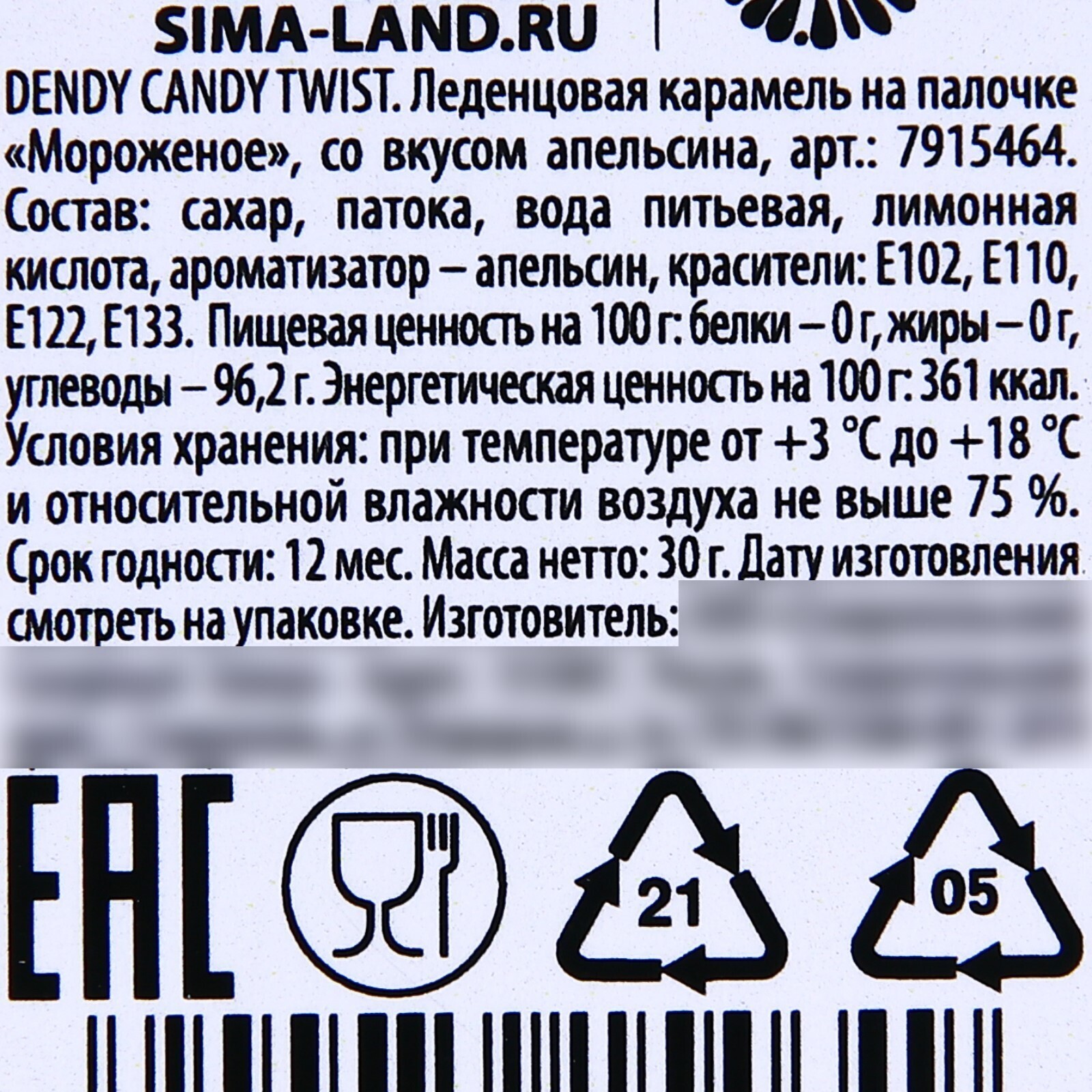 Состав: сахар, патока, вода питьевая, лимонная кислота, ароматизатор – апельсин, красители: Е102, Е110, Е122, Е133.