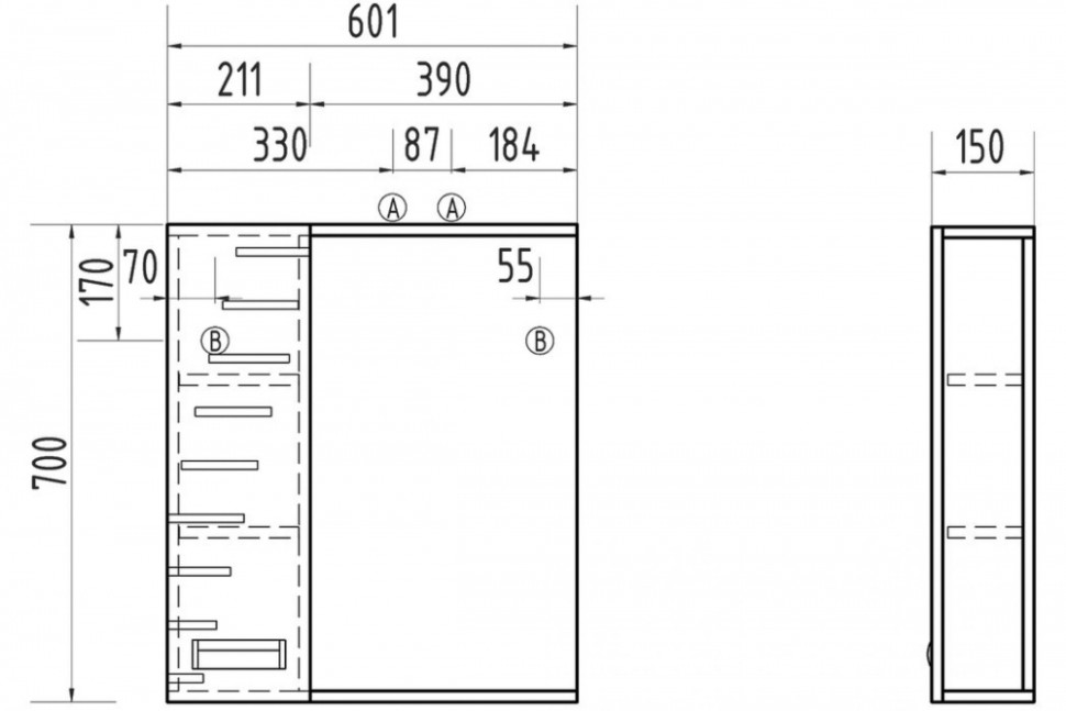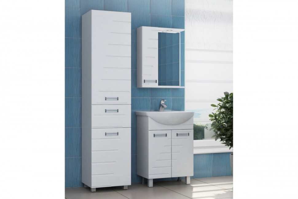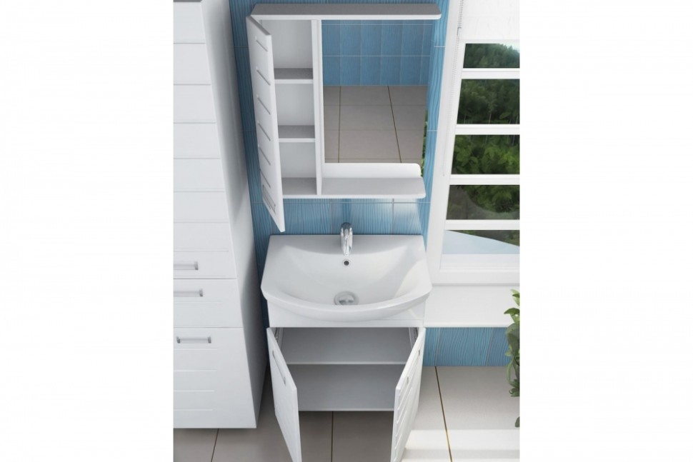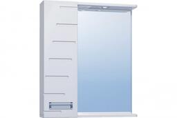 Левое/правое исполнение шкафчика. 1 дверца; 2 полки ЛДСП, 1 светодиодный светильник, включатель с розеткой; ручка врезная металлическая хромированная.
