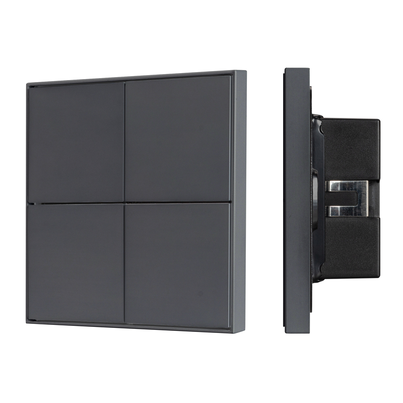 Универсальная многофункциональная встраиваемая настенная панель для систем KNX. 4 рокерные клавиши, 1 клавиша может выполнять функции 2-х клавиш. Тонкая рамка, материал - алюминий, отклик вибрацией, светодиодная индикация. Цвет корпуса - титановый чёрный. Питание от шины KNX DC 21-30V. Габариты 86x86x33 мм.