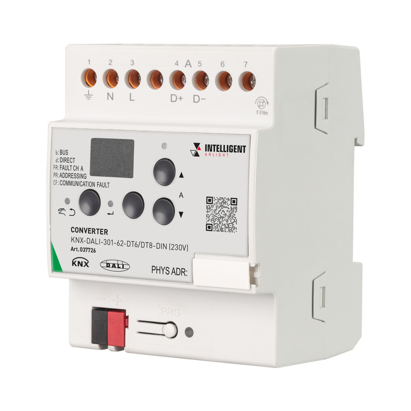 Конвертер KNX-DALI. Позволяет управлять исполнительными устройствами DALI из шины KNX. Установка на DIN-рейку. Конфигурация из ETS. 1 линия DALI на 64 устройства. Управление адресами, группами, сценами. Поддерживаются устройства DT6/DT8. Встроенный источник питания шины DALI. Напряжение питания AC 85-265V. Размер 90х72х64 мм.