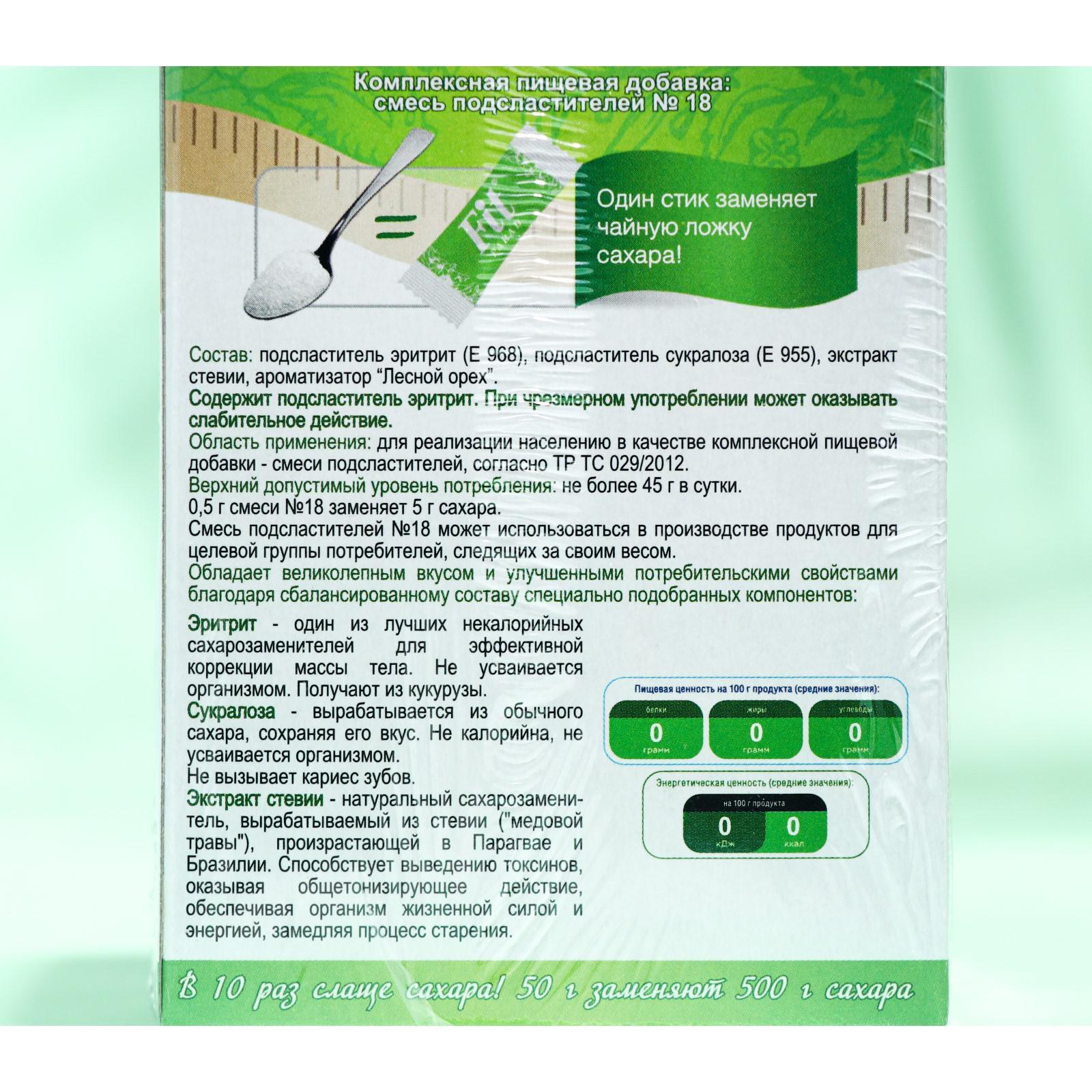 Состав: подасластитель эритрит (Е968), подсластитель сукралоза (Е955), экстракт стевии, ароматизатор «Лесной орех».