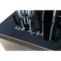 На чайном столике расположен кран подачи воды и два чайника, для кипячения и заварочный. Заварочному чайнику можно включить режим постоянного подогрева (~ до 60°С). Чайник кипячения изотермический – меньше греется, лучше сохраняет температуру. Подача воды в него возможна без открытия крышки. Нагрев воды в чайнике включается вручную. Автоотключение нагрева при температуре 100°С.