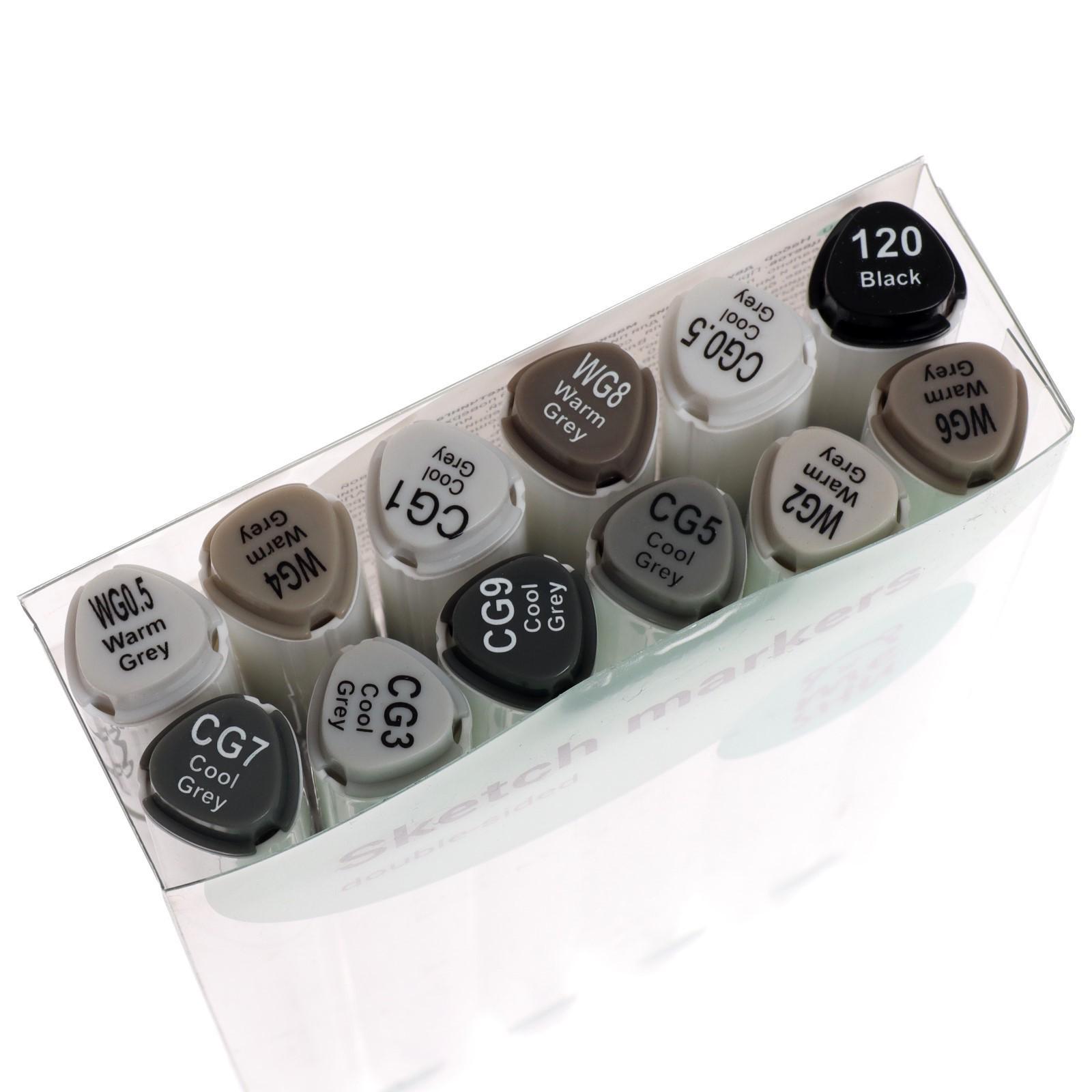 Маркеры для скетчинга двусторонние MESHU, 12 цветов (серые цвета)