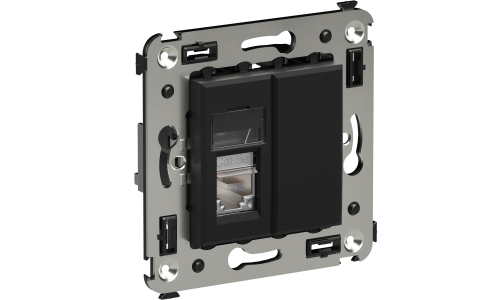Компьютерная розетка RJ-45 в стену, одинарная. Категория: 5e, экранированная. Предназначена для монтажа в подрозеточные коробки глубиной не менее 45 мм (код 59301). Используется для подключения сетевого кабеля к рабочему месту. Характеристики: 8P8C; с пылезащитной шторкой; с маркировочной табличкой. Заделка не требует инструмента. 2 модуля. Цвет: Черный матовый.