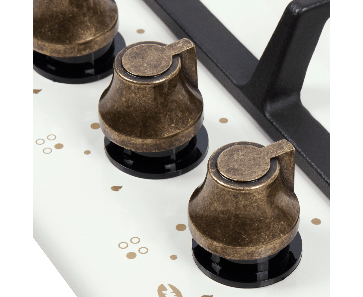 Управление подачей газа и поджигом конфорок происходит с помощью поворотных регуляторов - полнотелых цельнометаллических ручек цвета патинированной бронзы. Для простоты использования около каждой ручки нанесены информационные изображения: используемая конфорка, подача газа выключена, электроподжиг, максимальное пламя и минимальное пламя.