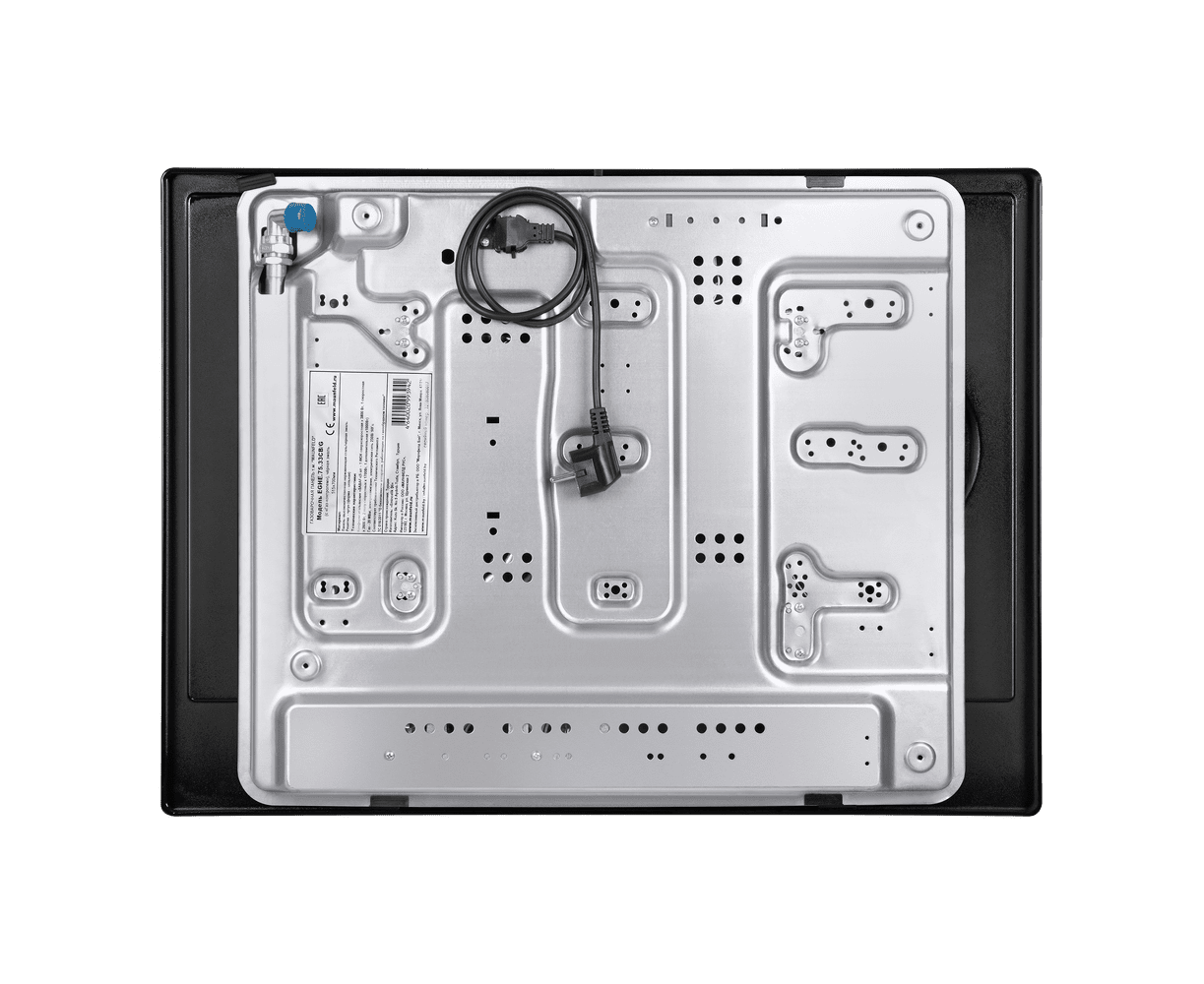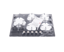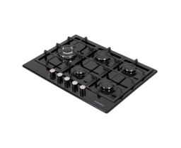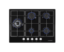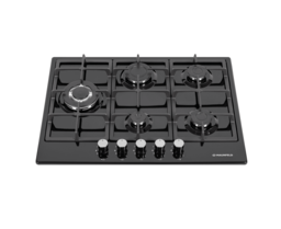 Панель выполнена из нержавеющей стали, покрытой термостойкой прочной эмалью черного цвета. В данной модели установлены высококачественные итальянские горелки SABAF. Четыре стандартные конфорки разного диаметра мощностью 1000 Вт, 1700 Вт, 1700 Вт, 2600 Вт и 1 сверхмощная WOK-конфорка с двойным пламенем мощностью 3800 Вт, расположенная на левой части панели.