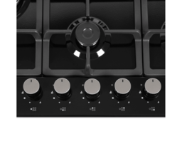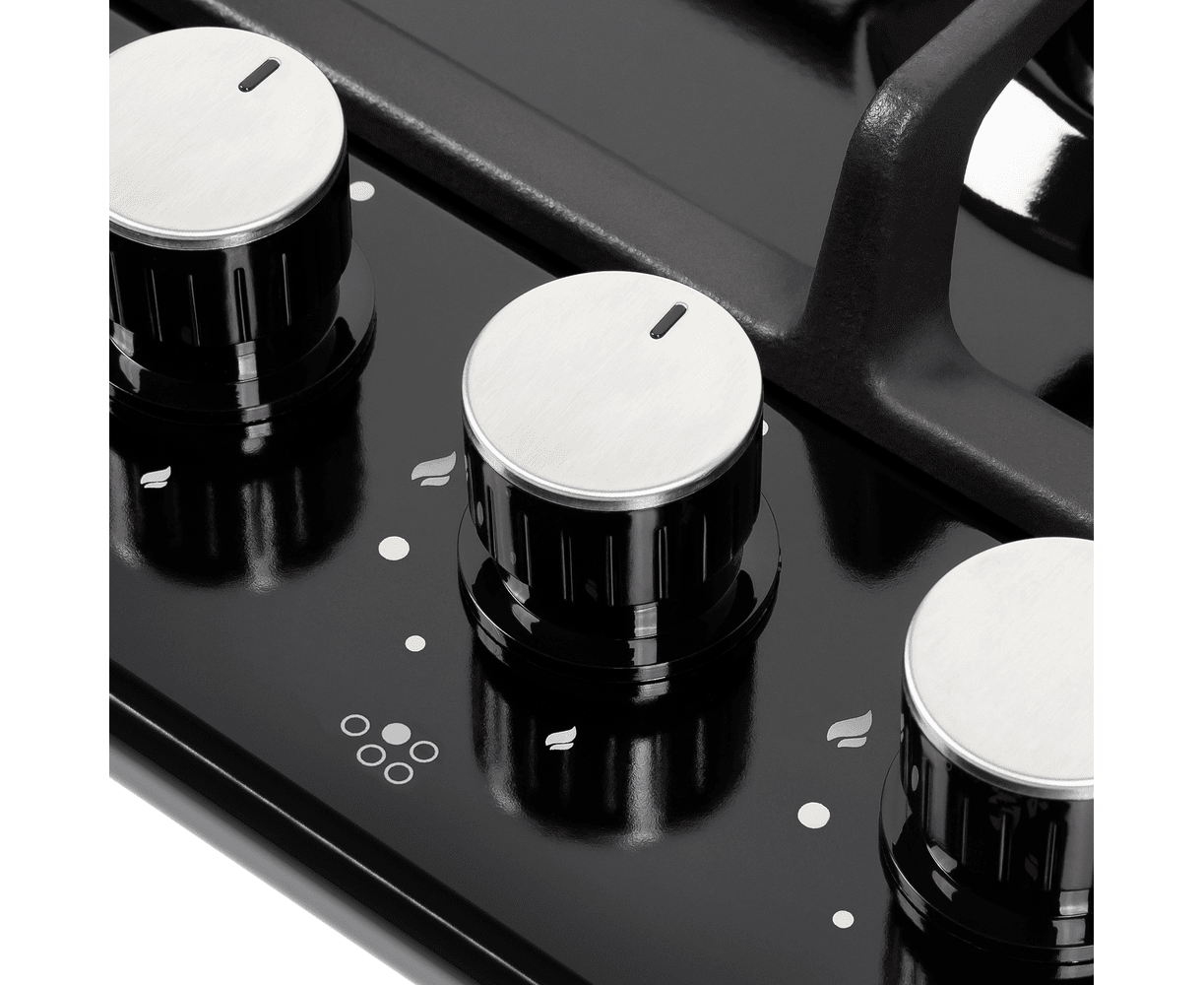 Регулирование подачи газа и электроподжиг конфорок производится с помощью поворотных регуляторов. Ручки из высокопрочного термостойкого пластика черного цвета располагаются по центру панели. Около каждой есть информационные изображения: используемая конфорка, подача газа выключена, электроподжиг, максимальное пламя и минимальное пламя.
