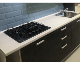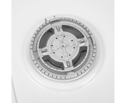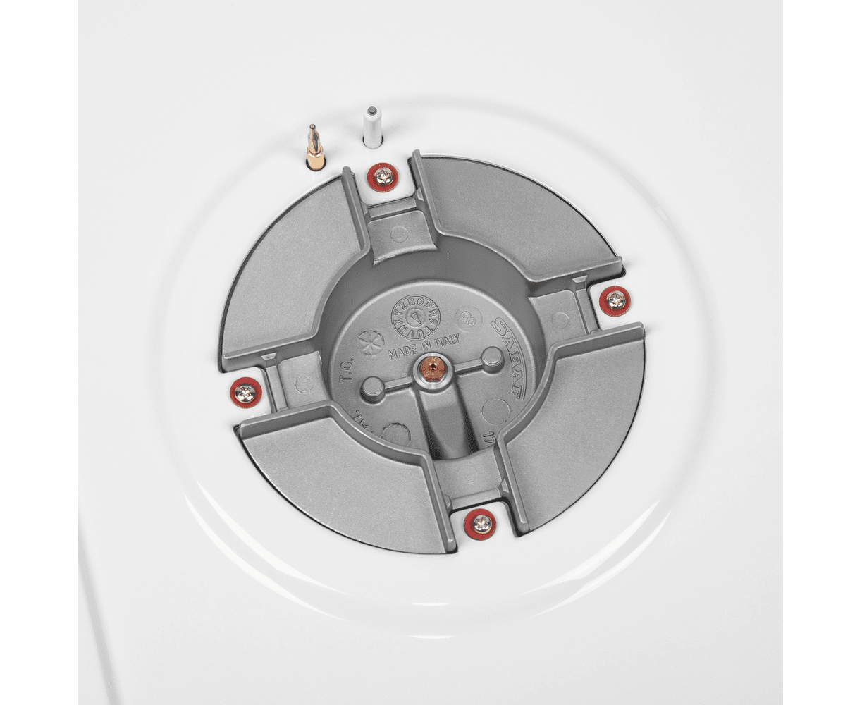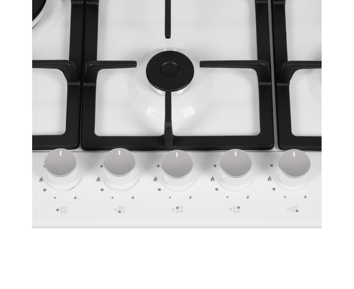 Панель выполнена из нержавеющей стали, покрытой термостойкой прочной эмалью белого цвета. В данной модели установлены высококачественные итальянские горелки SABAF. Четыре стандартные конфорки разного диаметра мощностью 1000 Вт, 1700 Вт, 1700 Вт, 2600 Вт и 1 сверхмощная WOK-конфорка с двойным пламенем мощностью 3800 Вт, расположенная на левой части панели.