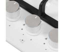 Регулирование подачи газа и электроподжиг конфорок производится с помощью поворотных регуляторов. Ручки из высокопрочного термостойкого пластика белого цвета располагаются по центру панели. Около каждой есть информационные изображения: используемая конфорка, подача газа выключена, электроподжиг, максимальное пламя и минимальное пламя.