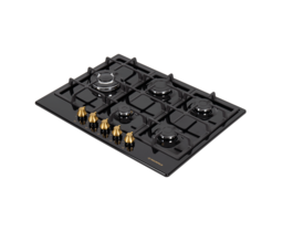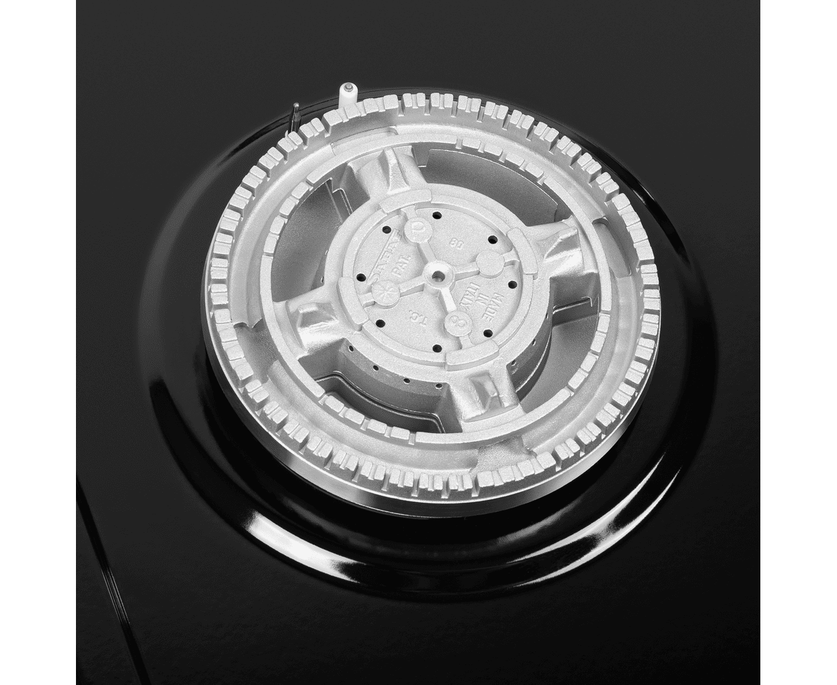 Панель выполнена из нержавеющей стали, покрытой термостойкой прочной эмалью черного цвета. В данной модели установлены высококачественные итальянские горелки «Sabaf». Четыре стандартные конфорки разного диаметра мощностью 1000 Вт, 1700 Вт, 1700 Вт, 2600 Вт и 1 сверхмощная WOK-конфорка с двойным пламенем мощностью 3800 Вт, расположенная на левой части панели.