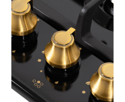 Управление подачей газа и поджигом конфорок происходит с помощью поворотных регуляторов - ярких цельнометаллических ручек цвета бронзы, выполненных в ретро-стиле. Для простоты использования около каждой ручки нанесены информационные изображения: используемая конфорка, подача газа выключена, электроподжиг, максимальное пламя и минимальное пламя.