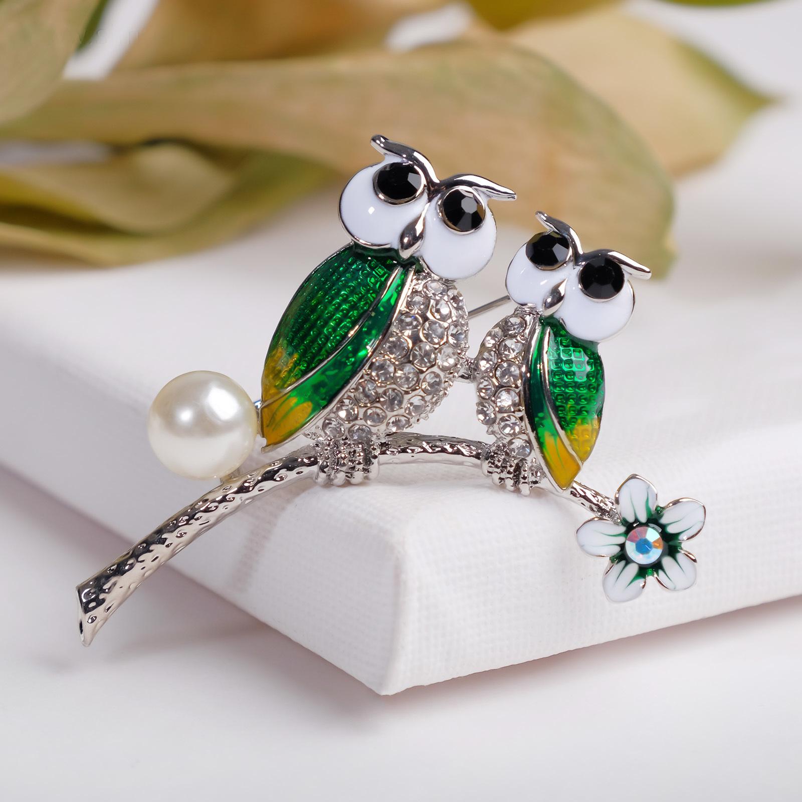 Брошь "Совы" на цветочной ветке, цвет бело-зелёный в серебре