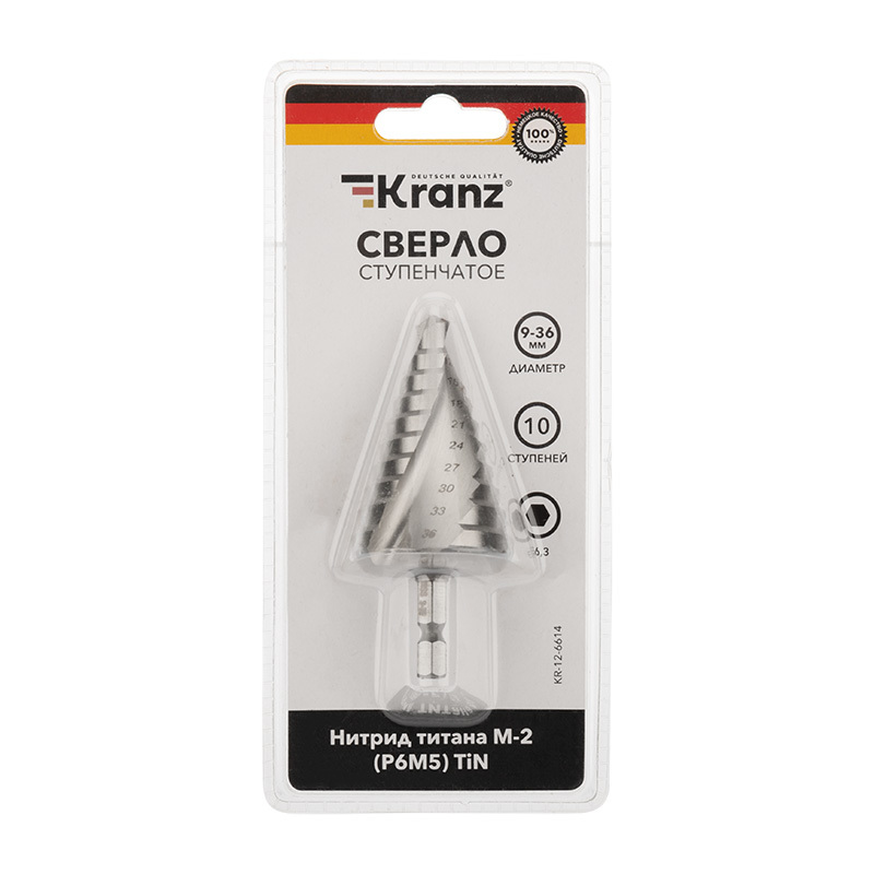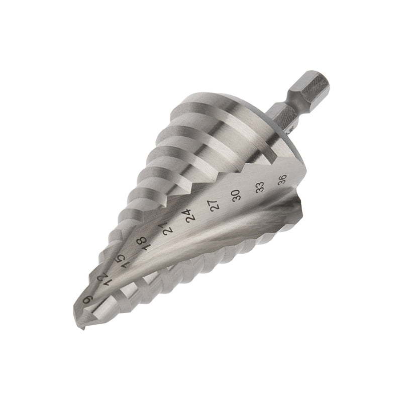Ступенчатое сверло предназначено для получения отверстий различного диаметра без перестановки режущего инструмента. Применяется в работе с такими материалами, как пластик, дерево, металл и др. Хвостовик прибора имеет форму конуса. На каждой ступени есть маркировка фактического диаметра. Сверло изготовлено из инструментальной легированной стали и покрыто нитридом титана.