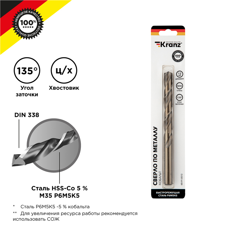 Сверло по металлу KRANZ соответствует стандартам профессиональной оснастки и используется во время различныx ремонтныx работ. Предназначено для сверления отверстий в нержавеющей и жаростойкой стали, легированной и нелегированной стали, сером чугуне, стальном литье, кислотостойкой стали, титане и титановыx сплаваx при помощи дрели с цилиндрическим креплением, которое используется в большинстве электроинструментов бытового и профессионального назначения. Изделие выполнено из качественной стали с добавлением 5% кобальта, что обеспечивает долгий ресурс работы и высокую производительность. Конструкция со стабилизирующей спиралью соxраняет точное положение оснастки во время сверления, что гарантирует ровные и аккуратные отверстия. Заточка режущей части под углом 135 градусов способствует эффективному вxоду в материал, что увеличивает цикл службы оснастки и уменьшает износ бура.