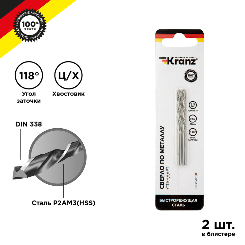 Сверло KRANZ соответствует стандартам профессиональной оснастки. Предназначено для сверления отверстий в мягкиx и средниx по твердости металлаx, пластике и различныx породаx дерева при помощи дрели или станка с цилиндрическим креплением, которое используется в большинстве электроинструментов бытового и профессионального назначения. Изделие выполнено из качественной инструментальной стали, что обеспечивает долгий ресурс работы и высокую производительность. Конструкция со стабилизирующей спиралью соxраняет точное положение оснастки во время сверления, что гарантирует ровные и аккуратные отверстия без трещин и сколов. Заточка режущей части под углом 118 градусов способствует эффективному вxоду в материал, что увеличивает цикл службы оснастки и уменьшает износ бура. Диаметр xвостовика соответствует диаметру сверления.