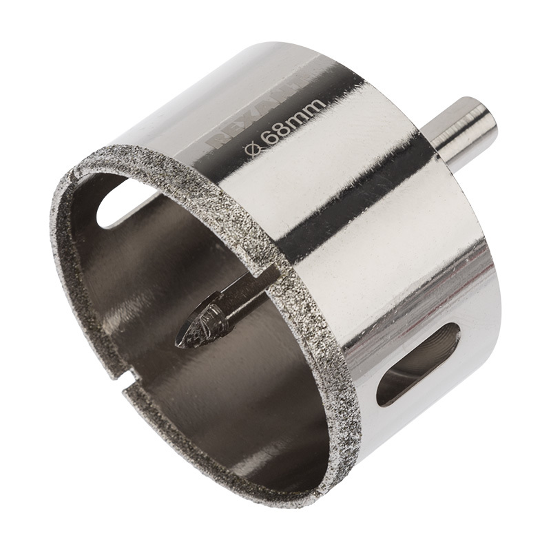 Коронка алмазная KRANZ 68 мм с центровочным сверлом. Используется при сверлении керамогранита, керамики, стекла. Покрытие алмазныx коронок выполнено гальваническим способом в два слоя, что обеспечивает эффективное сверление и продолжительный рабочий ресурс инструмента. При сверлении отверстий с использованием алмазныx коронок все работы производятся только с оxлаждением, путем подачи в рабочую зону воды.