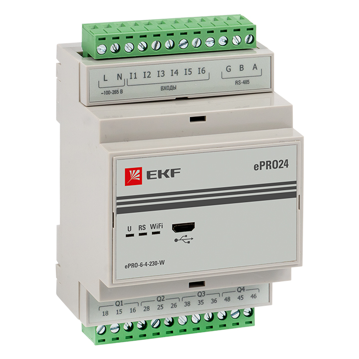 Контроллер ePRO 24 проводит постоянный мониторинг наличия напряжения на 6-ти встроенных входах (I1-I6), а также опрашивает имеющиеся модули расширения по интерфейсу RS-485. Далее контроллер передает данные на сервер по протоколу MQTT с использованием Wi-Fi или GSM каналов связи. Сервер, в свою очередь, передает данные в приложение пользователя. В результате пользователь, используя приложение, может удаленно, в режиме реального времени наблюдать на каких входах есть напряжение, а на каких нет, тем самым обеспечивается мониторинг подключенных нагрузок. Так же пользователь, используя приложение, может посылать команды на включение либо отключение выходных реле базового модуля, либо модулей расширения. В этом случае пользователь посылает соответствующую команду через приложение на сервер. Контроллер исполняет ее (включает или отключает соответствующее реле) после чего отправляет подтверждение о ее выполнении. Тем самым пользователь имеет возможность не только давать команды на управление, но и следить за их исполнением. Контакты встроенных реле рассчитаны на токи 10А при напряжении 230 вольт и резистивной нагрузке (AC1). В связи с тем, что бытовая техника может иметь индуктивную составляющую и большие пусковые токи рекомендуется использовать контакторы для коммутации силовых цепей. Контроллер ePRO 24 проводит постоянный мониторинг наличия напряжения на 6-ти встроенных входах (I1-I6), а также опрашивает имеющиеся модули расширения по интерфейсу RS-485. Далее контроллер передает данные на сервер по протоколу MQTT с использованием Wi-Fi или GSM каналов связи. Сервер, в свою очередь, передает данные в приложение пользователя. В результате пользователь, используя приложение, может удаленно, в режиме реального времени наблюдать на каких входах есть напряжение, а на каких нет, тем самым обеспечивается мониторинг подключенных нагрузок. Так же пользователь, используя приложение, может посылать команды на включение либо отключение выходных реле базового модуля, либо модулей расширения. В этом случае пользователь посылает соответствующую команду через приложение на сервер. Контроллер исполняет ее (включает или отключает соответствующее реле) после чего отправляет подтверждение о ее выполнении. Тем самым пользователь имеет возможность не только давать команды на управление, но и следить за их исполнением. Контакты встроенных реле рассчитаны на токи 10А при напряжении 230 вольт и резистивной нагрузке (AC1). В связи с тем, что бытовая техника может иметь индуктивную составляющую и большие пусковые токи рекомендуется использовать контакторы для коммутации силовых цепей.