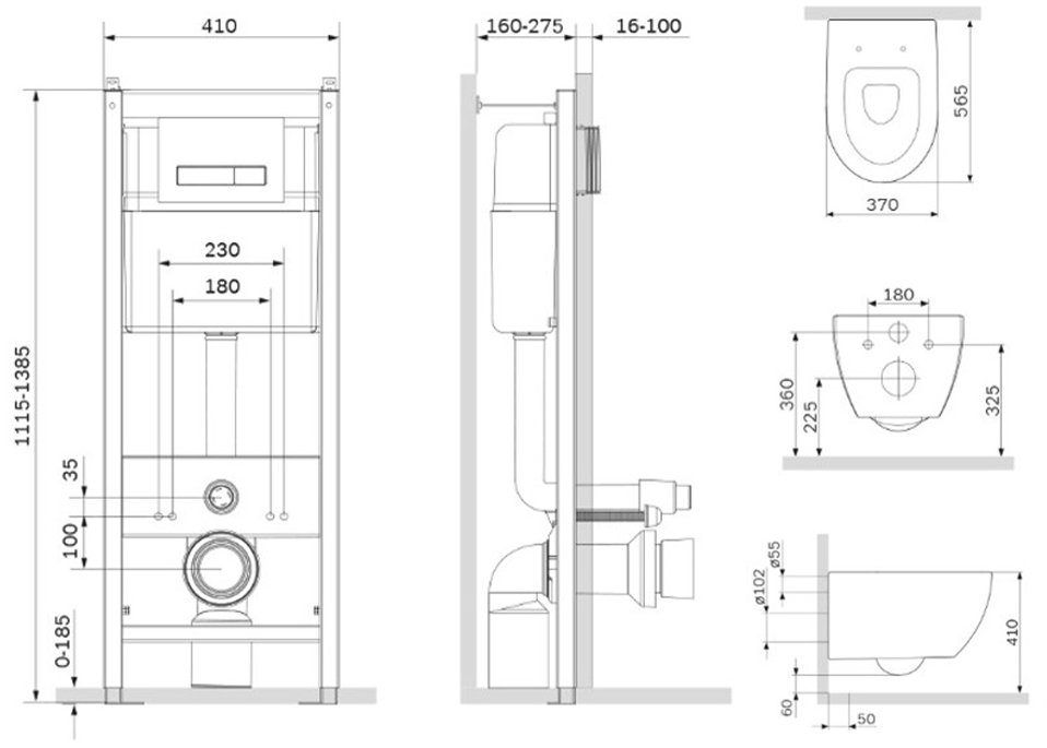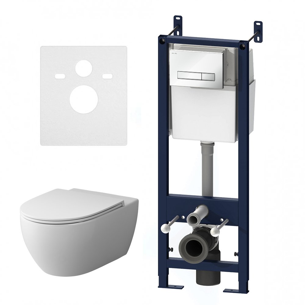 Полностью готовый к установке комплект: система инсталляции с клавишей, подвесной унитаз с сиденьем. Неразборная рама из стального профиля выдерживает нагрузку до 400 кг. Полностью изолированный бачок с двухрежимной смывной арматурой. Укомплектован механической клавишей в цвете белый. В комплекте все необходимые патрубки и крепления, а также прокладка между унитазом и стеной - звукоизоляция.