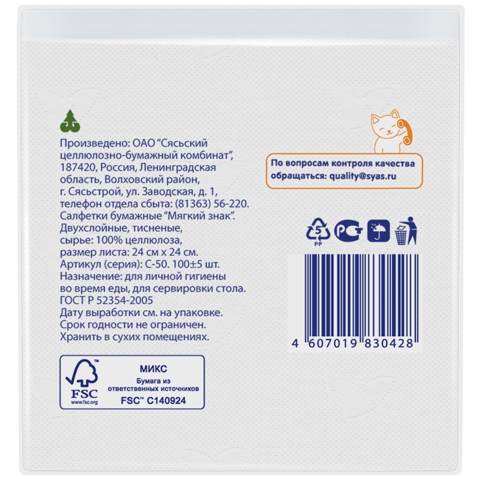 Салфетки "Мягкий знак", 24 х 24 см, белые, 2 слоя, 100 листов