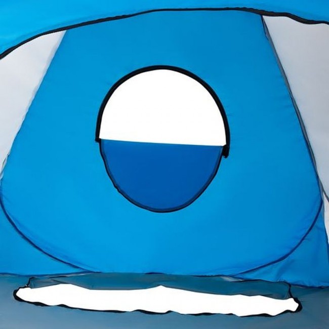 Тент палатки сшит из плотной ткани Oxford адаптированной к низкотемпературным режимам, характеризуется высокой прочностью и устойчивостью к влаге. Дно снабжено специальным отверстием для лунок, закрывающимся на молнию. Это очень удобно. В палатке с полом рыболову ловить гораздо комфортнее, теплее. По углам палатки сделаны петли под ввертышей, для надежного фиксирования на льду. Есть большое окно на замке, регулирующее микроклимат внутри. Вход в палатку закрывается двухсторонней молнией, что обеспечивает удобное закрытие и открытие входа. Светлые стенки палатки не нарушают освещенность при ловле в пасмурную погоду. Палатка мгновенно раскрывается и быстро складывается обратно в круглый чехол-переноску. Легкая и компактная, пригодна для частого использования.