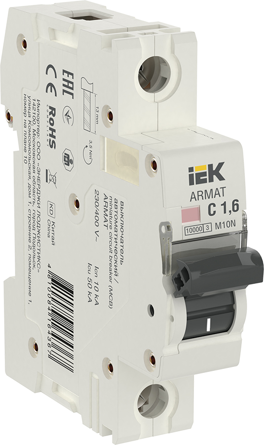 Автоматические выключатели ARMAT серии M10N предназначены для защиты цепей от перегрузки и короткого замыкания. Модельный ряд включает в себя устройства с характеристиками срабатывания B, C, D и номинальными токами от 0,5 до 63 А. Номинальная отключающая способность автоматических выключателей ARMAT серии M10N составляет 10 кА. Предельная отключающая способность варьируется в зависимости от номинала от 10 до 50 кА.