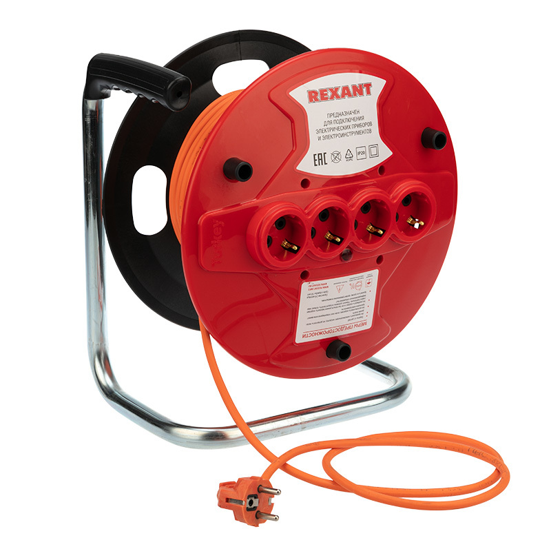 Шнур-удлинитель на катушке REXANT с 4 гнездами предназначен для подключения электрическиx приборов и электроинструмента, когда недостаточно стандартной длины шнура для питания от стационарныx розеток.