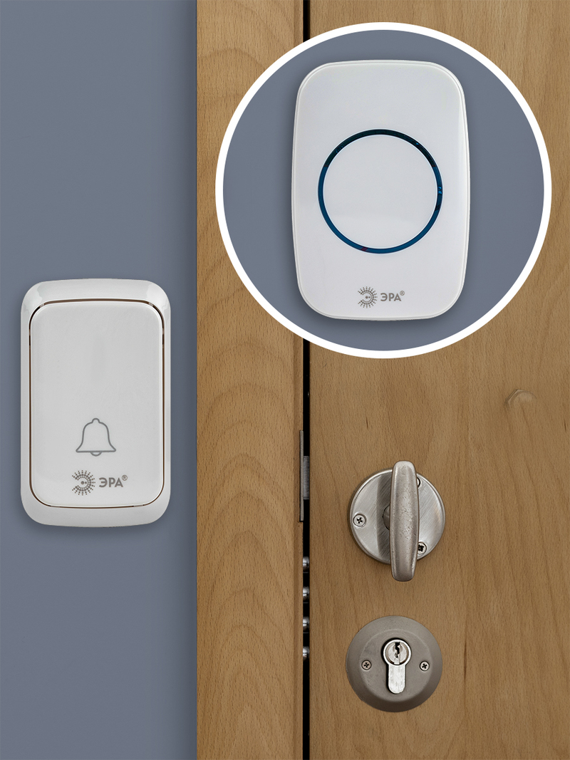 ЭРА С89 – звонок дверной беспроводной с кнопкой. Выполнен в актуальном минималистичном дизайне. Корпус базового белого цвета, кнопка декорирована лаконичным синим ободком. Компактный и легкий звонок крепится двумя способами – на саморезы или самоклеящуюся основу, поставляемые в комплекте. Доступен выбор мелодии звонка из встроенной базы с 38 полифоническими вариантами. Мелодии можно менять по настроению, по сезону и т.д. Звонок не требует подключения к электросети – работает от батареек: 3 «пальчиковые» (не в комплекте) и А23 для кнопки (в комплекте). Цвет данного дверного звонка - белый (арт. Б0054090), в ассортименте ЭРА есть аналогичная модель в чёрном цвете - арт. Б0054087.