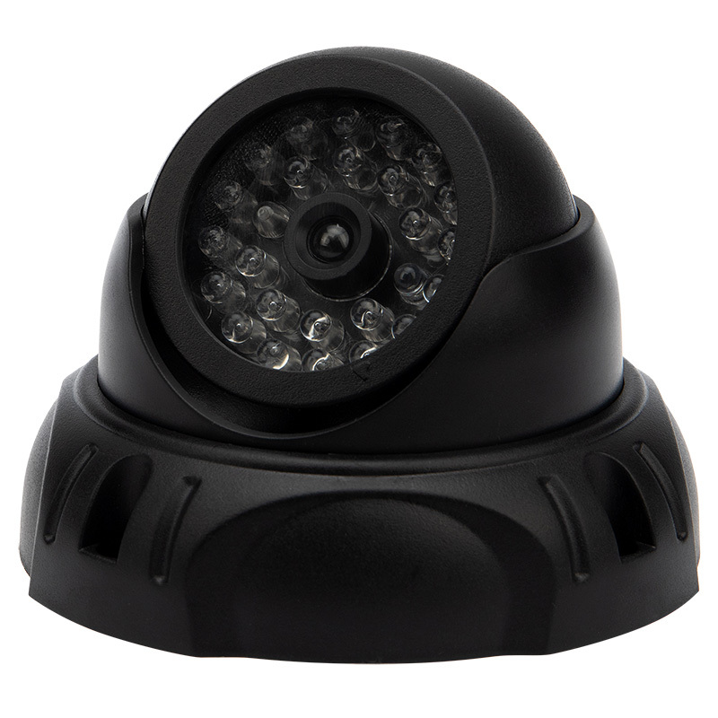 Муляж внутренней купольной камеры видеонаблюдения черного цвета с мигающим красным светодиодом неотличим от обычной камеры.