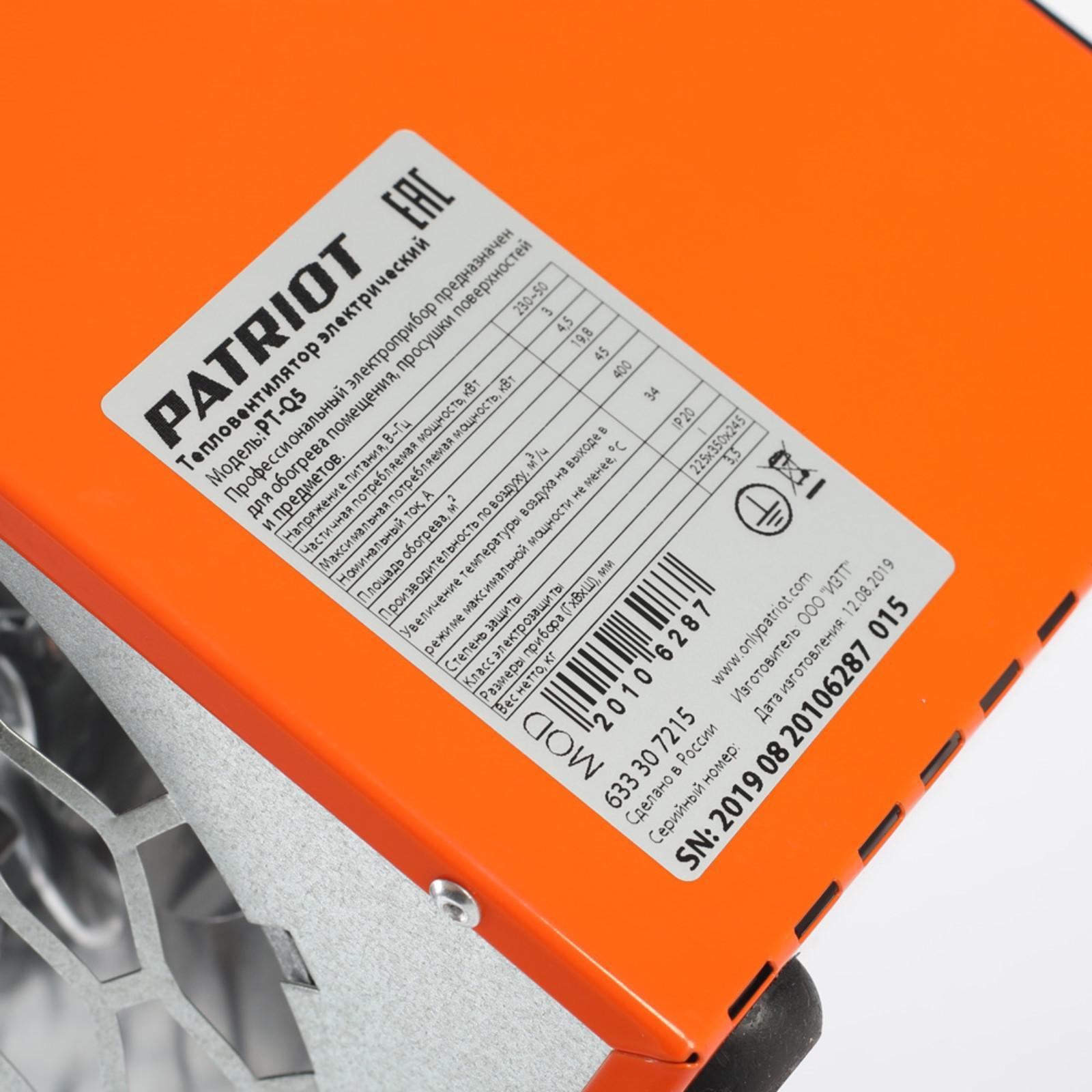 Тепловая пушка PATRIOT PT-Q 5, 220 В, 4.5 кВт, 400 м3/ч, нерж.ТЭН, термостат, кабель ввод