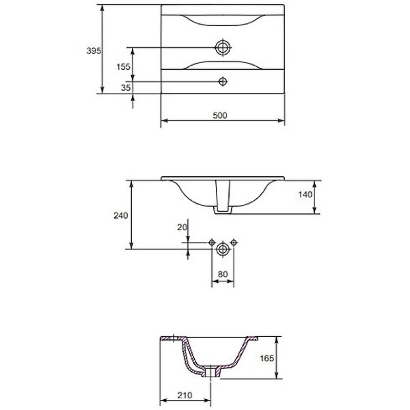 Тонкая раковина Ontario, размером 50 см. Может устанавливаться на тумбу, а также в столешницу. Имеет отверстие под смеситель, а также отверстие перелива.