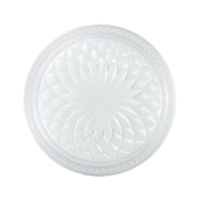 Светильник 2082/EL линии DEGIRA состоит из металлического основания (базы) и пластикового рассеивателя. Материал рассеивателя - высококачественный акрил белого матового цвета, обеспечивающий светильнику равномерное рассеивание и хорошее светопропускание. Форма плафона: круглая, в виде рельефного, составного орнамента, который декорирован прозрачными точками, придающими включенному светильнику красивый эффект "звездного мерцания" и переливания. Степень защиты IP43 позволяет использовать светильник в определенных зонах влажных помещений. В комплект входит заменяемый LED модуль с линзами, мощностью 72Вт, которая соответствует лампе накаливания 520Вт. А также пульт ДУ, с помощью которого осуществляется плавное изменение цветовой температуры 3000-6000К, изменение яркости, переход в режим переключения теплого/белого/холодного/ночного света. Светильник имеет функцию "память". Степень защиты IP43, класс защиты 1, гарантия (месяцы) 30, дополнительные параметры Беспроводной пульт ДУ, тип крепления накладной