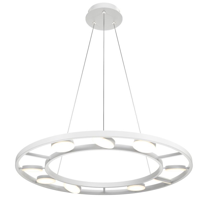 В основе дизайна светильников этой серии лежит трехмерная ритмическая композиция из геометрических тел. На тонких пересекающихся между собой стержнях установлены цилиндрические плафоны, каждый из которых вращается на 340° в горизонтальной и 90° в вертикальной плоскостях. Гибкий функционал расширяет возможности для формирования различных сценариев и интуитивного светового зонирования помещения. За счет безрамочной конструкции плафона и интегрированного LED-модуля обеспечивается яркое равномерное свечение по всей поверхности рассеивателя. На корпусе бра и настольной лампе установлены выключатели с функцией плавного диммера. Серия объединяет подвесные, настенные, настольные и напольные модели. Вместе они составляют готовый ансамбль для комплексной подсветки современного интерьера. Светильник подвесной LED 54W 2800Lm 3000K Матовый Белый металл На тонких пересекающихся между собой стержнях установлены цилиндрические плафоны (9шт), каждый из которых вращается на 340° в горизонтальной и 90° в вертикальной плоскостях. Габаритные размеры: Диаметр - 800 мм Высота - 200 - 1500 мм