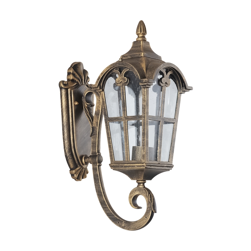 Широкий ассортимент серии включает настенные, подвесные и напольные светильники. Алюминиевый корпус моделей не подвержен коррозии и устойчив к перепадам температур. Волнистое стекло плафона обеспечивает красивые световые узоры. Модели представлены в двух цветах: античная бронза и черный с золотом. Источник света – лампы с цоколем Е27.