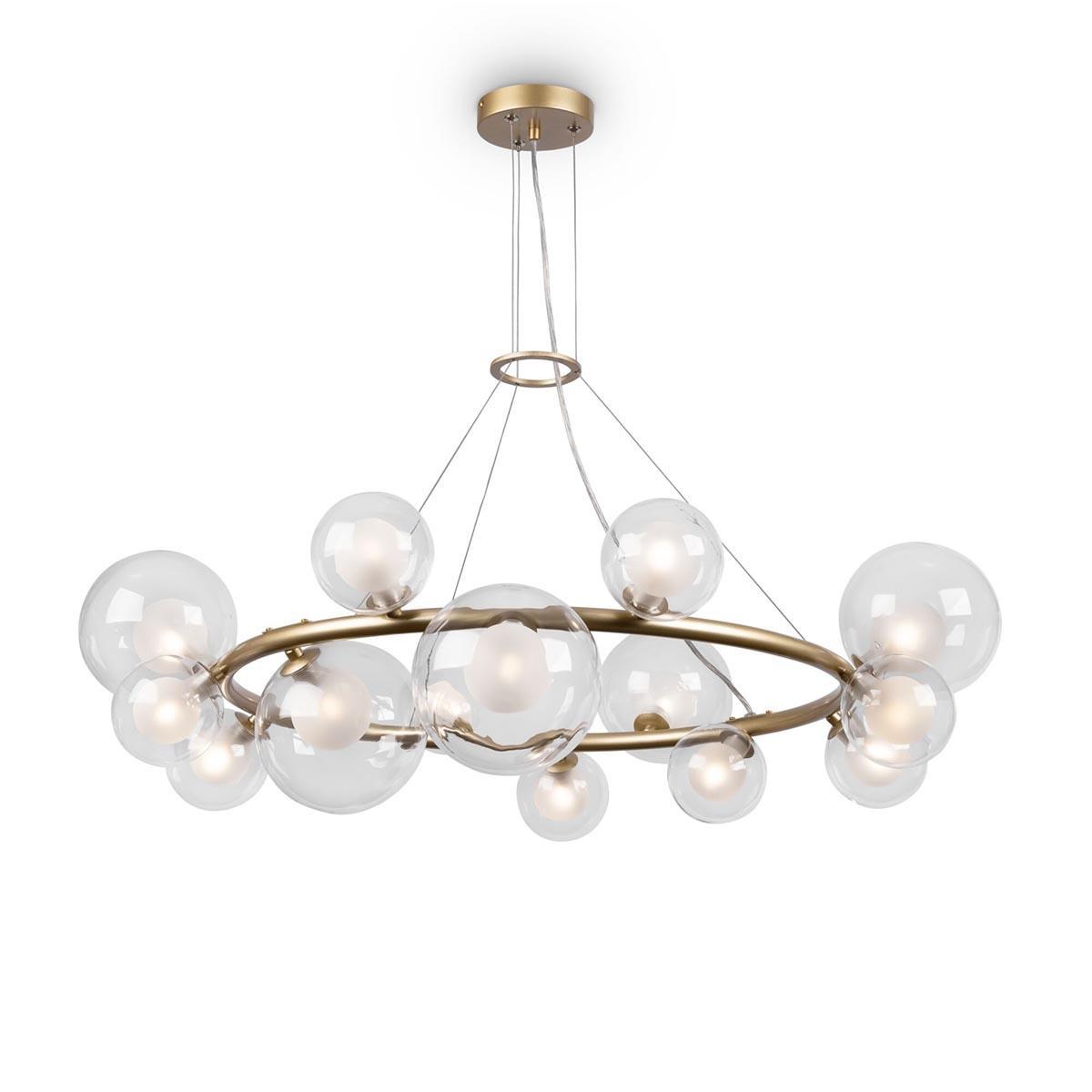 Создавая серию Duo, дизайнеры вдохновлялись стилистикой mid-century modern, в частности – «молекулярной» формой предметов. Арматура оттенка матового золота выполнена из металла, а двойные плафоны-сферы – из стекла. Внутренняя часть плафона – белого цвета, внешняя – прозрачная. Расположенные вдоль широкой окружности, они обеспечивают равномерное, яркое освещение. Визуальную легкость композиции подчеркивают тонкие, почти невидимые тросы – создается иллюзия трендового «парящего» света. Две подвесные люстры обеспечивают различную интенсивность подсветки – можно выбрать подходящий вариант (из 10 или 14 плафонов) с учетом размеров помещения. Светильники станут эффектным акцентным элементом обстановки в стиле mid-century modern, постмодерн, ар-деко, эклектика, хай-тек.