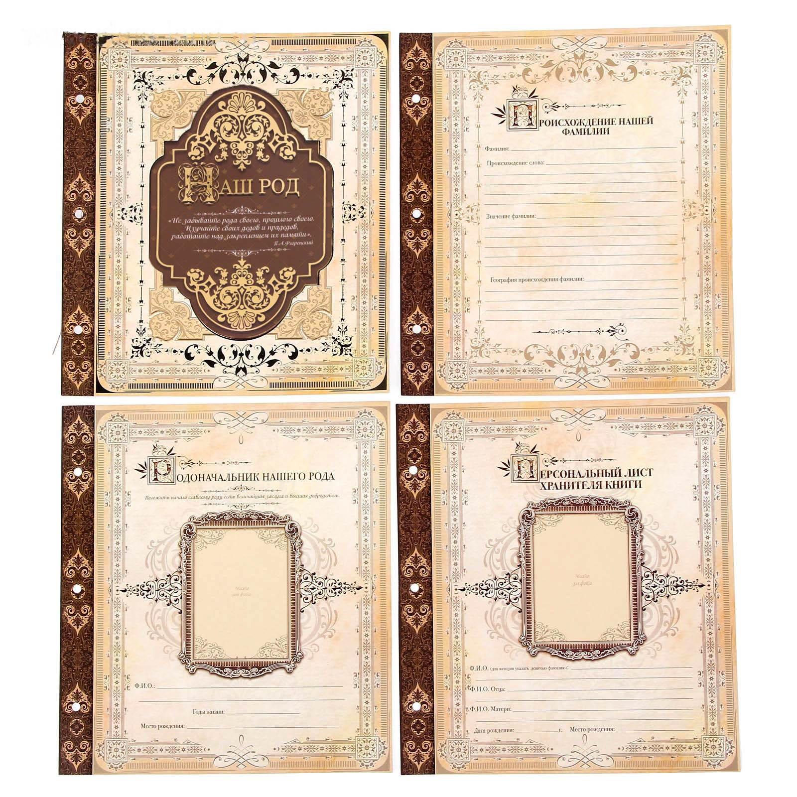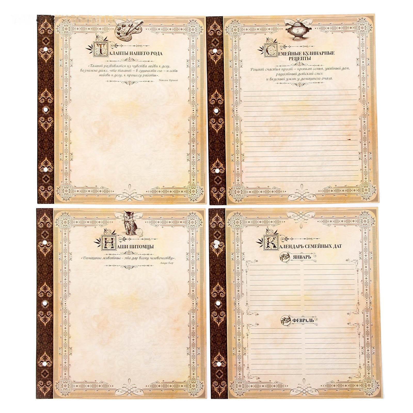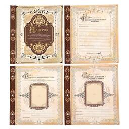 Книга на кольцах содержит 50 листов (включая инструкции и наименования разделов), лист генеалогического древа и 2 листа наклеек.
