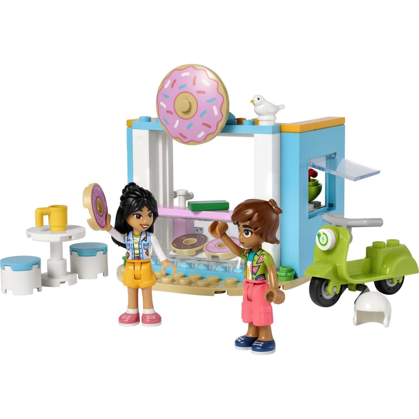 Маленькі шанувальники випічки будуть у захваті від створення історій з допомогою конструктору LEGO Friends Магазин пончиків. Ця творча іграшка вчить дітей конструюванню, доки вони займаються творчістю з шанувальницею мистецтва Ліан й любителем випічки Лео. Оптимізм й ентузіазм Ліани перетворюють її на чудову подругу для Лео, який нещодавно переїхав до міста. У набір входять аксесуари, як-от миска, ягоди, чашка, три пончика, сік, гроші, два стільці й стіл, щоб діти вчилися завдяки грі, готуючи смаколики. Набір містить кубик для початківців — міцну основу, на якій діти створюють свій іграшковий магазин пончиків. Дозвольте додатку LEGO Builder стати вашим провідником у будівельних пригодах. Масштабуйте й обертайте моделі в 3D, зберігайте декорації і відстежуйте прогрес.