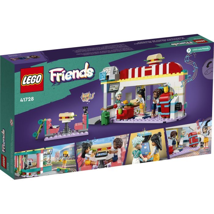 Діти можуть розігрувати безліч ресторанних історій з допомогою цього конструктору LEGO Friends Хартлейк Сіті: ресторанчик в центрі міста. Завдяки безлічі аксесуарів, що надихають на творчу гру, діти можуть вдавати, що роблять сендвічі або уявляти себе відвідувачами ресторанчику. Серед аксесуарів є: сервіс обслуговування в авто; столики на відкритому повітрі; аркадна гра; музичний автомат. Діти можуть використовувати інгредієнти салату в холодильнику для приготування сендвічів. Інші аксесуари включають два напої, гроші, три скибочки хліба для сендвічів, серветницю, бак для сміття та скейтборд.