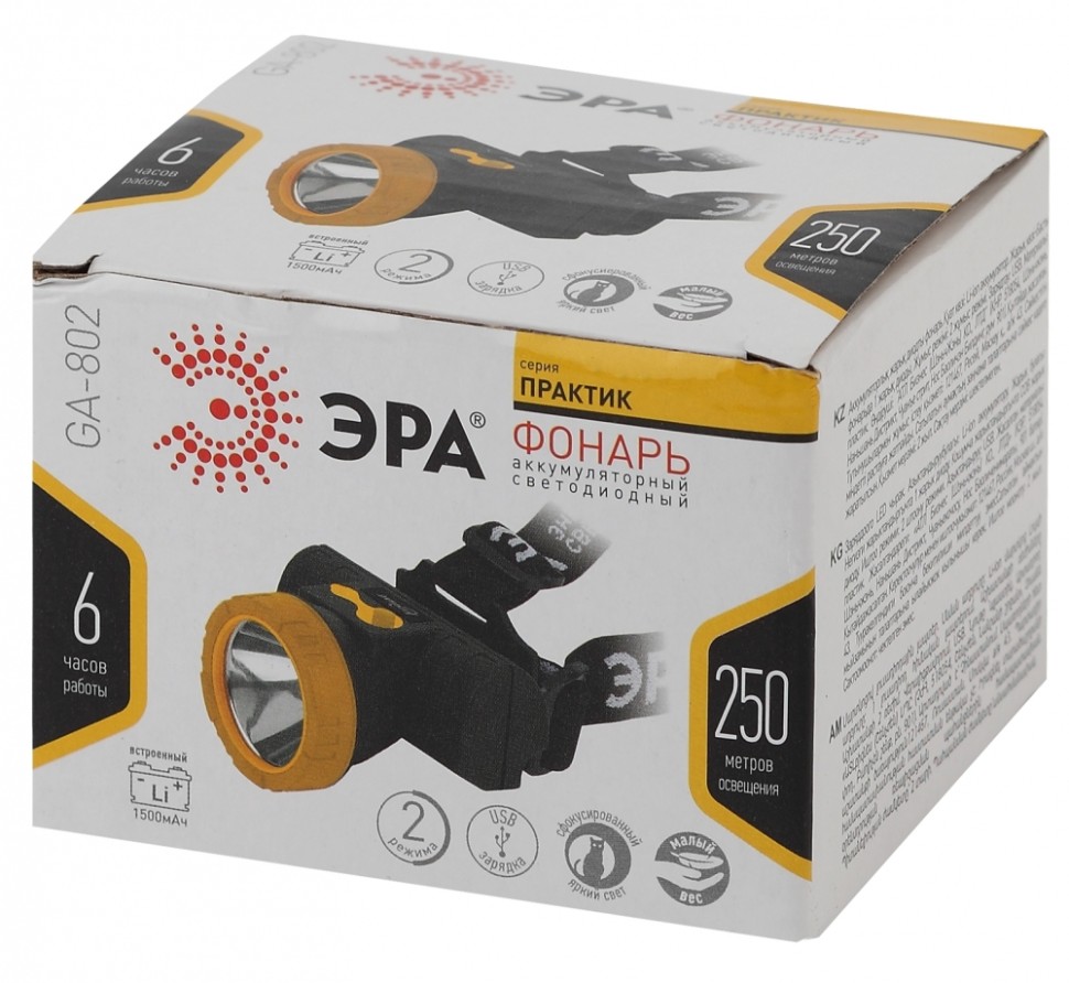 Светодиодный налобный фонарь на аккумуляторе. Дальность луча - 250м. USB. Эра налобный серия Практик GA-802 (Б0033765)