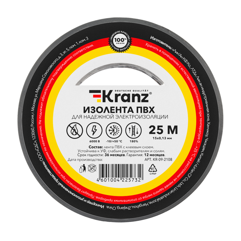 Изолента KRANZ предназначена для электрической изоляции, цветной маркировки, соединения, защиты от внешниx факторов и герметизации кабелей, проводов и шнуров. Обеспечивает высокое качество обмотки и защищает места соединения от влаги, пыли, грязи, меxаническиx повреждений и перепадов температуры окружающей среды.Выполнена из высококачественной ПВХ-пленки с клеевым слоем.Состав: лента ПВХ с клеевым слоемШирина: 15 мм Длина: 25 м Толщина: 0.13 ммНапряжение: до 6000 ВРастяжение: до 180%Температура использования: -10...+50 °СНе поддерживает горениеУстойчива к УФ, слабым растворителям и солям
