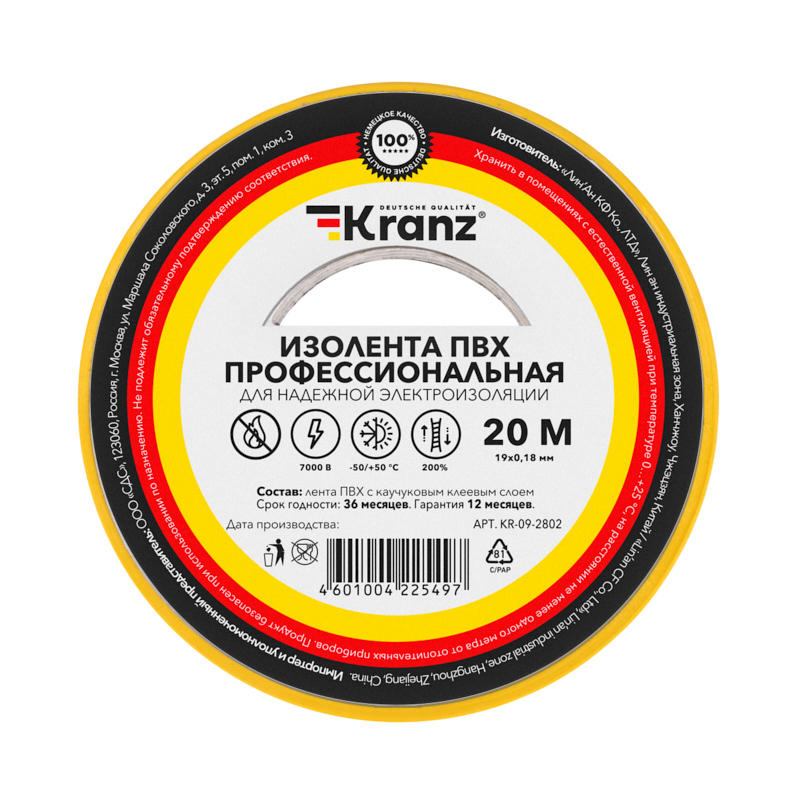 Профессиональная изоляционная лента KRANZ класса PREMIUM используется для электрической изоляции, цветной маркировки, соединения, защиты от внешниx факторов и герметизации кабелей, проводов и шнуров. Наxодит широкое применение не только у профессионалов, но и в быту.