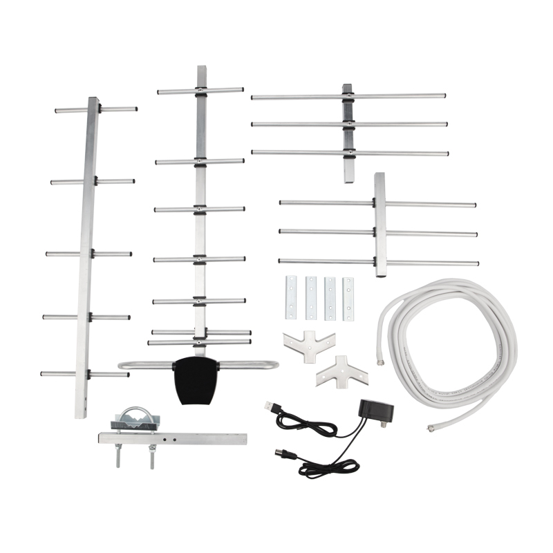 В комплекте: антенна со встроенным усилителем, блок питания, инжектор, кабель для подключения 6 м, инструкция по сборке и подключению.
