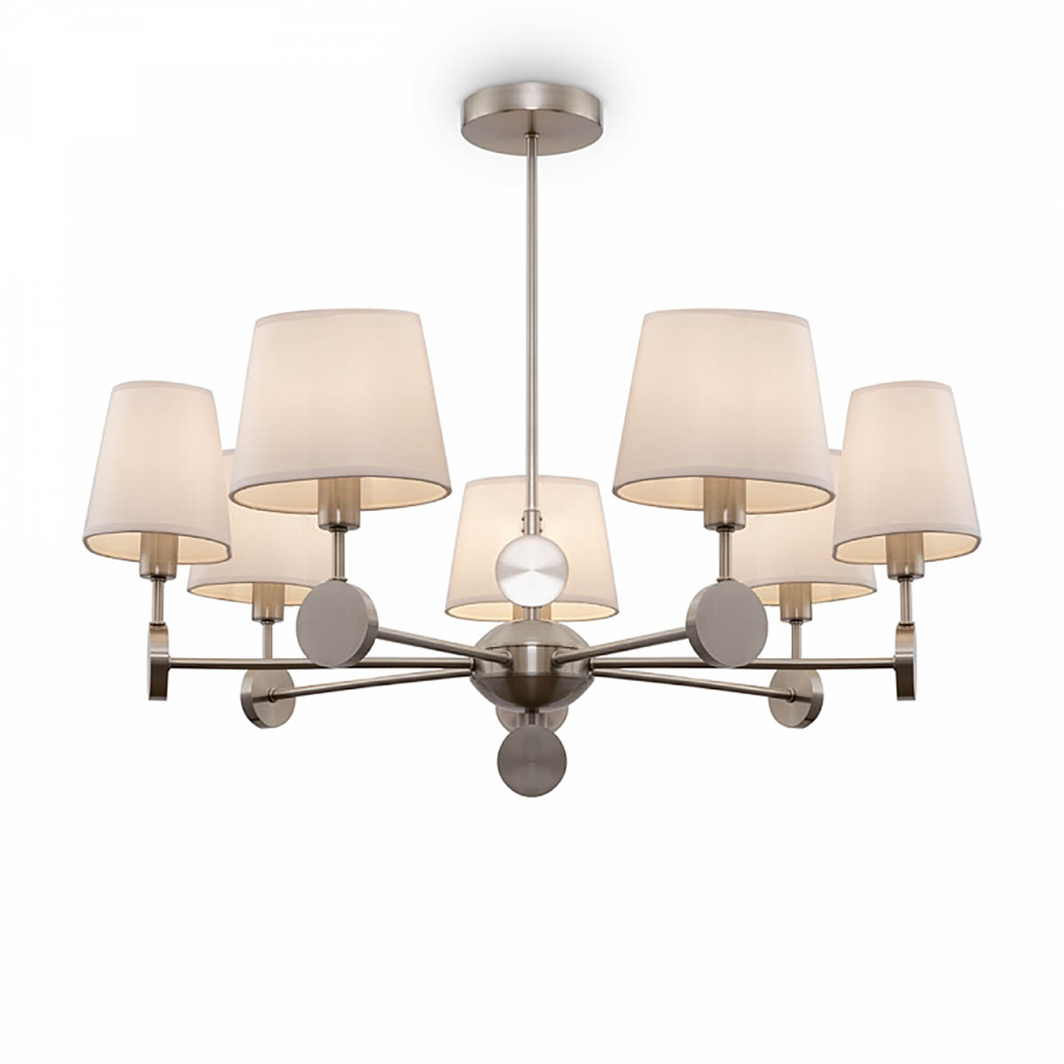 Эклектичный дизайн позволяет серии Soho гармонично сочетать мотивы неоклассики и современные конструктивистские идеи. Привлекает внимание актуальная форма металлической арматуры, сочетающей четкие линии с округлыми элементами. Цвет никеля прекрасно оттеняют сатиновые абажуры необычного дизайна. Их вытянутая форма идеально дополняет геометрию светильников. Игра цвета в округлых элементах светильника дарит праздничные блики и переливы. Серия легко адаптируется как в классических, так и в современных интерьерах, оформленных в стиле mid-century modern, неоклассика, контемпорари. Широкий ассортимент включает люстры на 7, 5 и 3 плафона, одиночный подвес, настольную лампу и бра. Все светильники снабжены цоколем для ламп Е14.